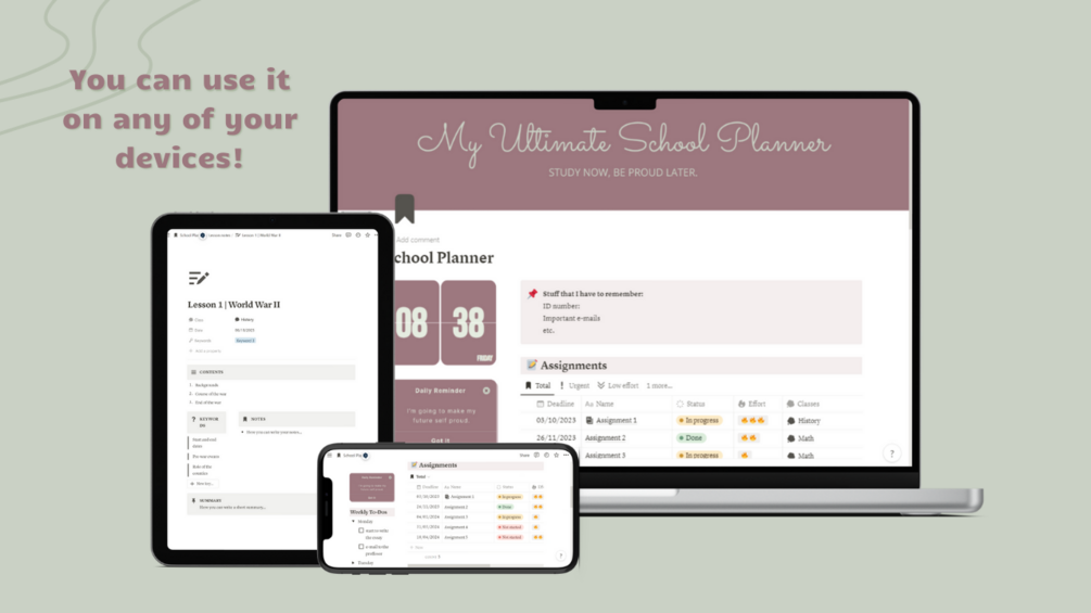 You'll get a full Notion template, that includes an assignment manager, a database to your courses and a section to your lesson notes.